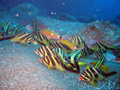 ツバメウオの群れ、アカヒメジの群れ、ホウセキキントキの群れ、ホウライヒメジの群れ、